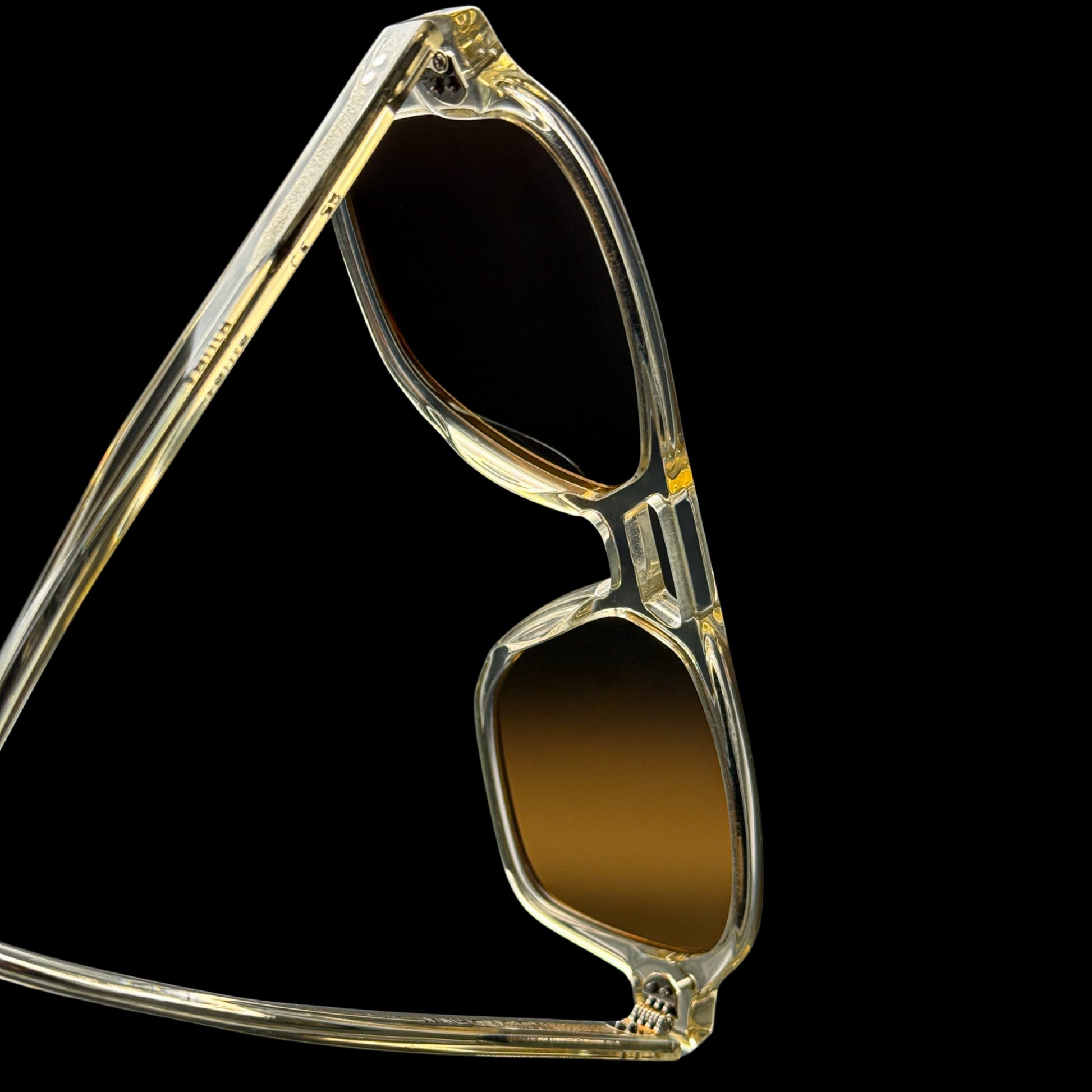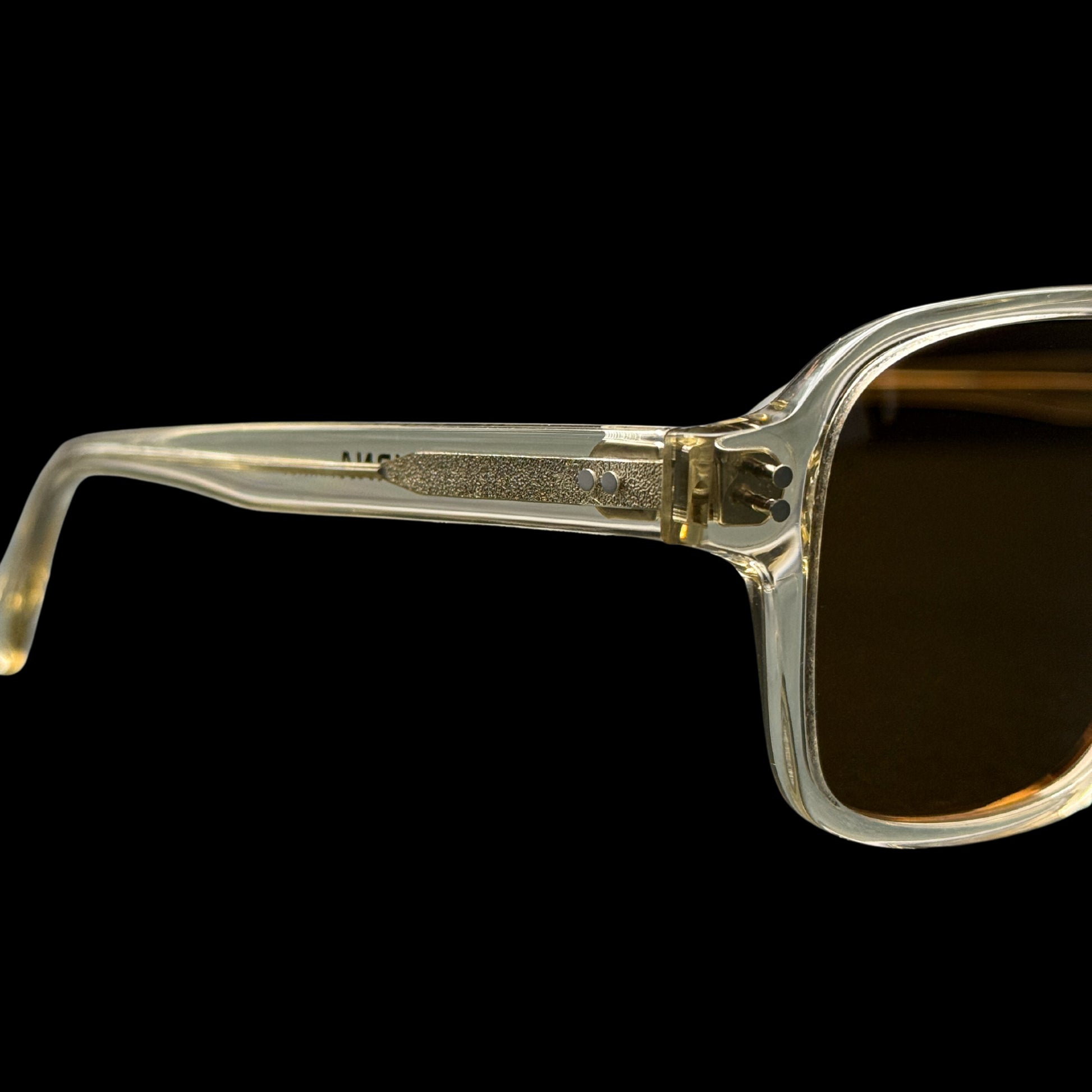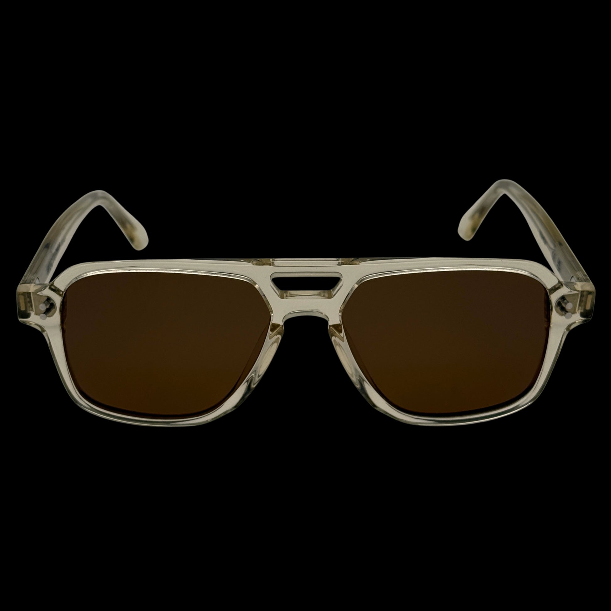 Handcrafted from Mazzucchelli 1849 acetate - plant-based, biodegradable, made in Italy - the warmclear tone reveals the architecture of the frame itself. Its translucent body carries subtle golden undertones, softening the geometry without compromising authority. Brown TAC polarized lenses with full UV400 protection cut glare while preserving clarity.